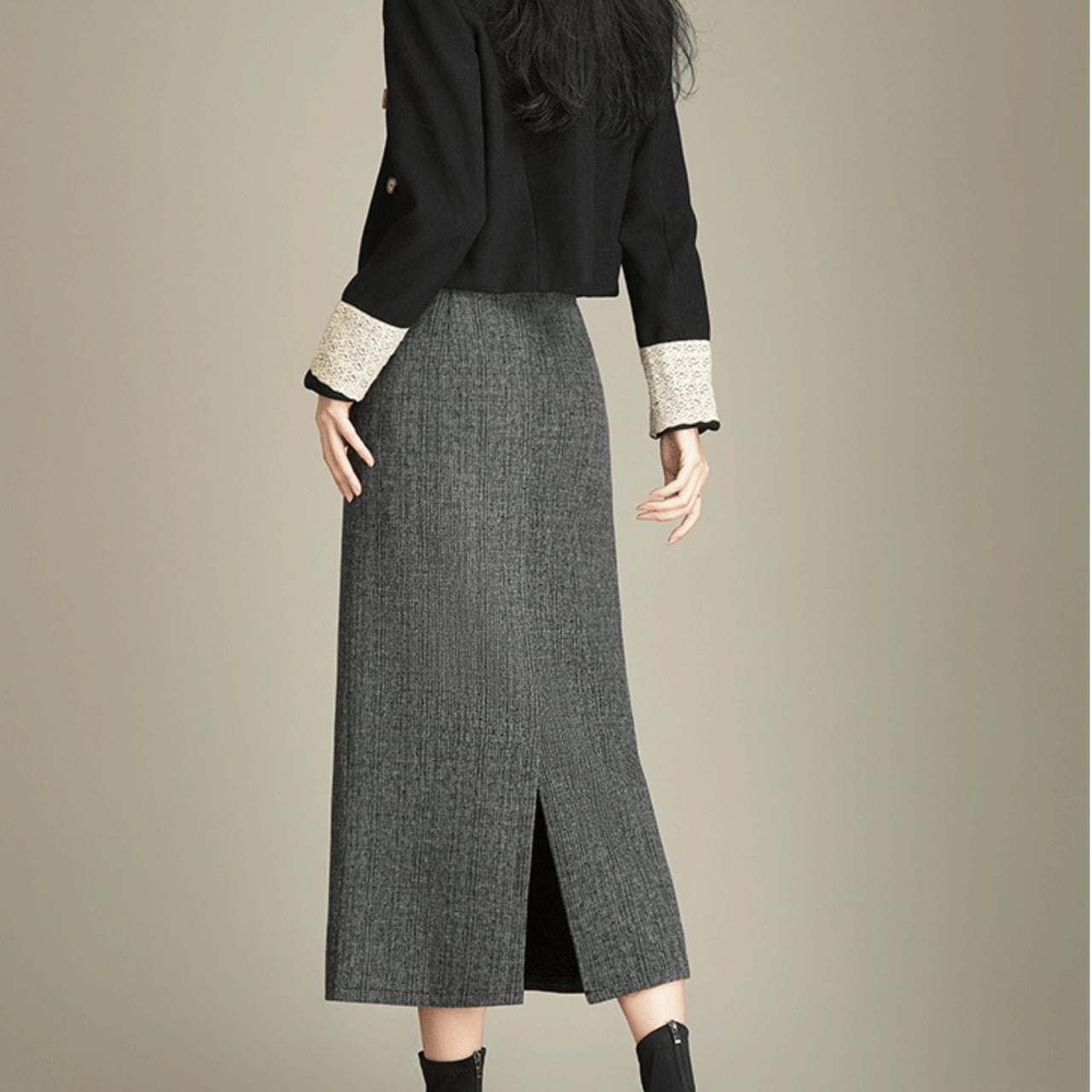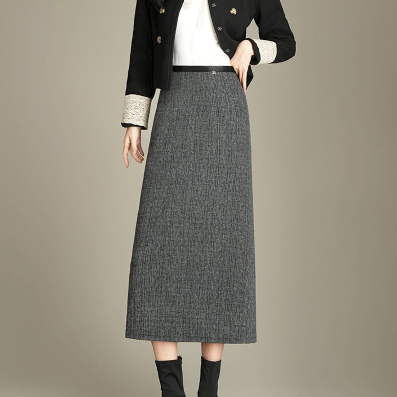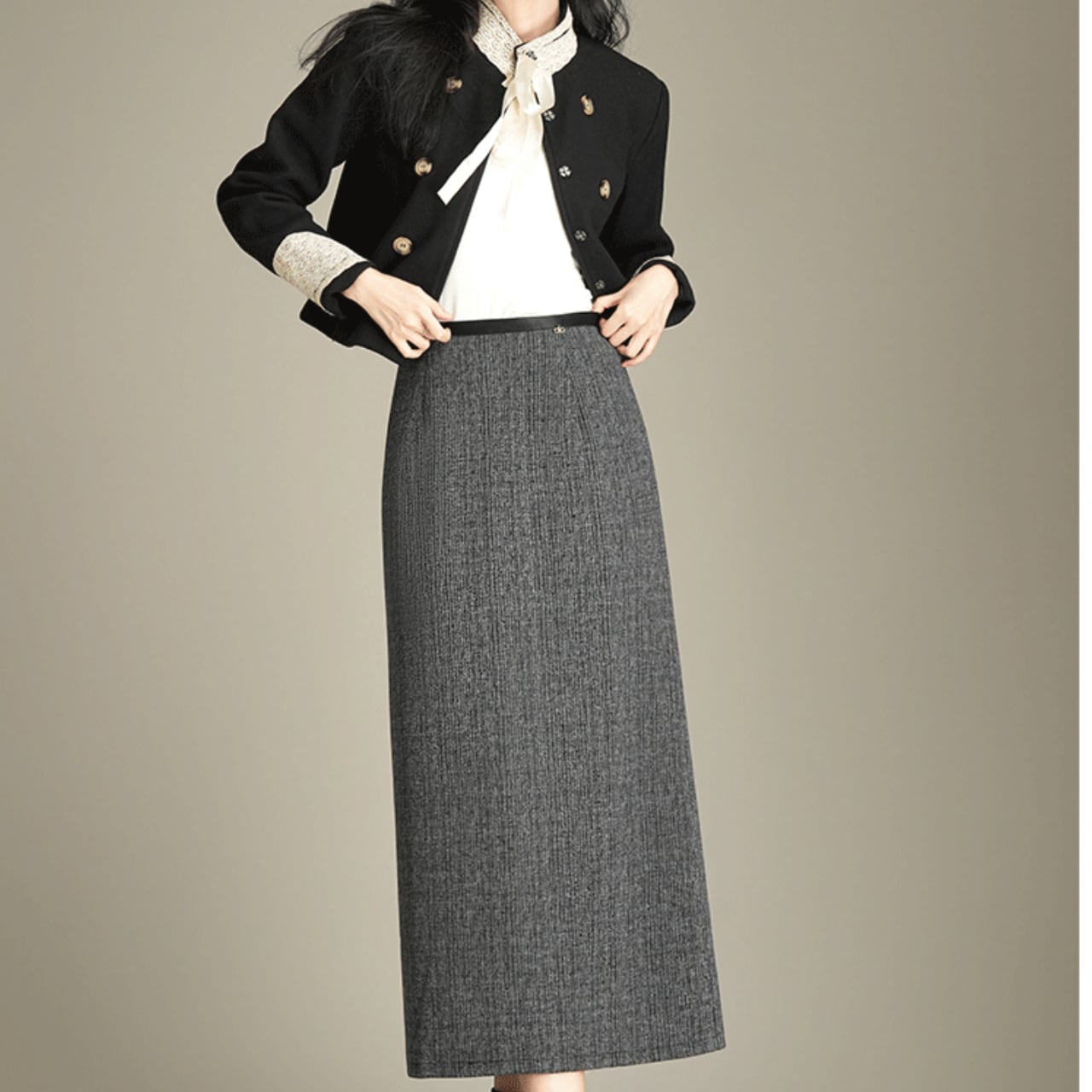 Iラインシルエットが美しいロングスカート。オフィスシーンにもデイリーユースにも対応できる、着回し力の高い一着です。