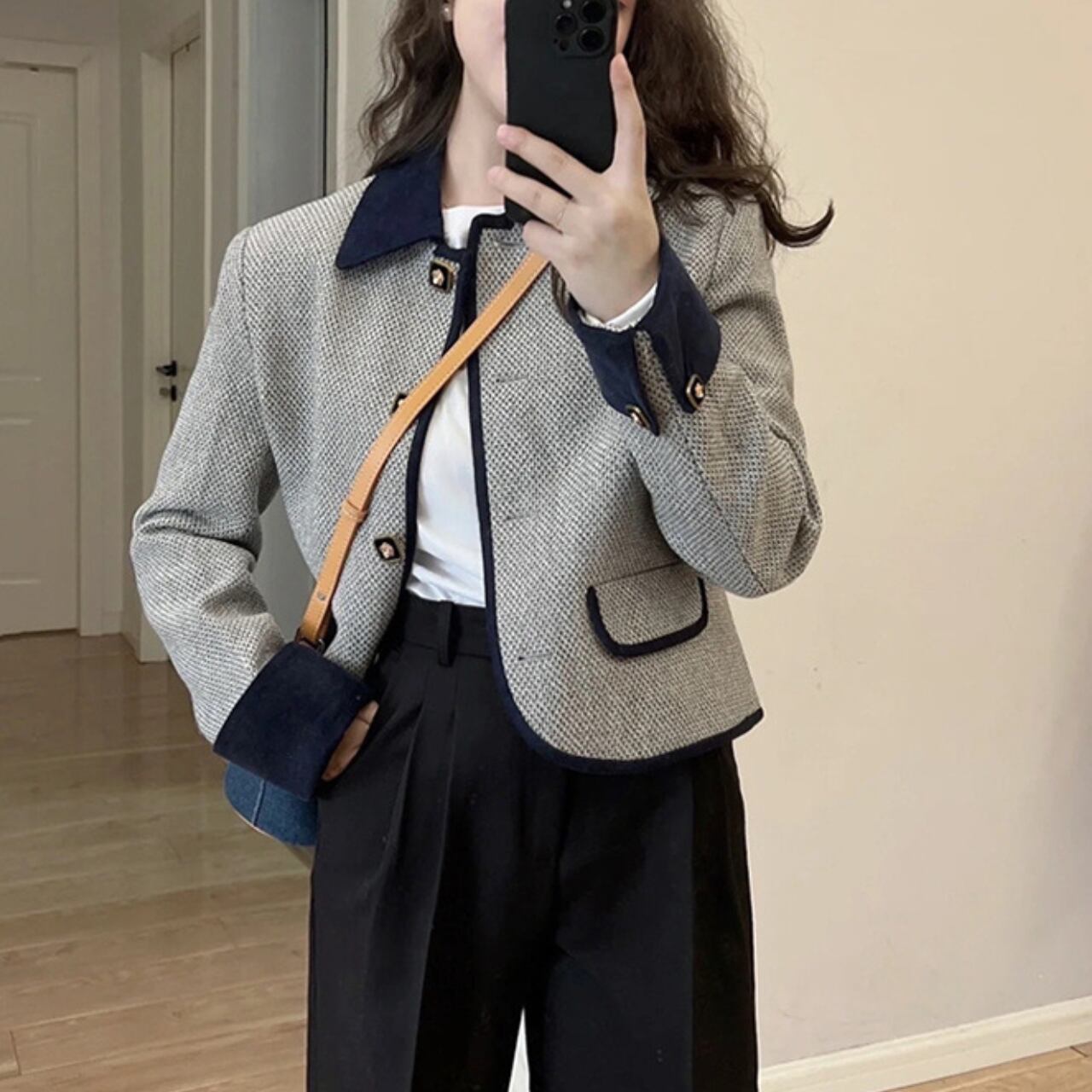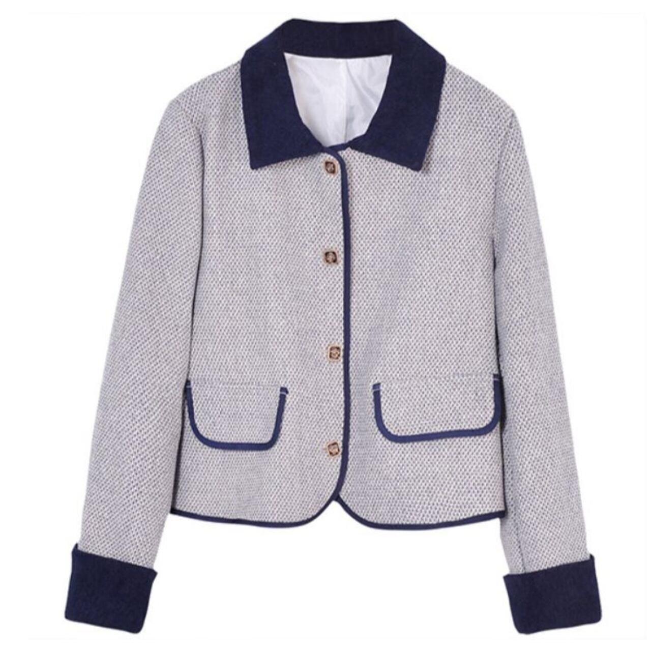 パイピングデザインがアクセントとなり、上品さをプラスします。オフィススタイルにはもちろん、カジュアルな装いにも合わせやすい一枚。