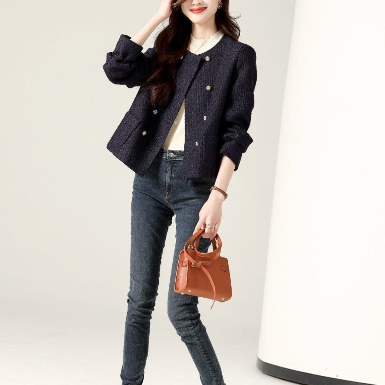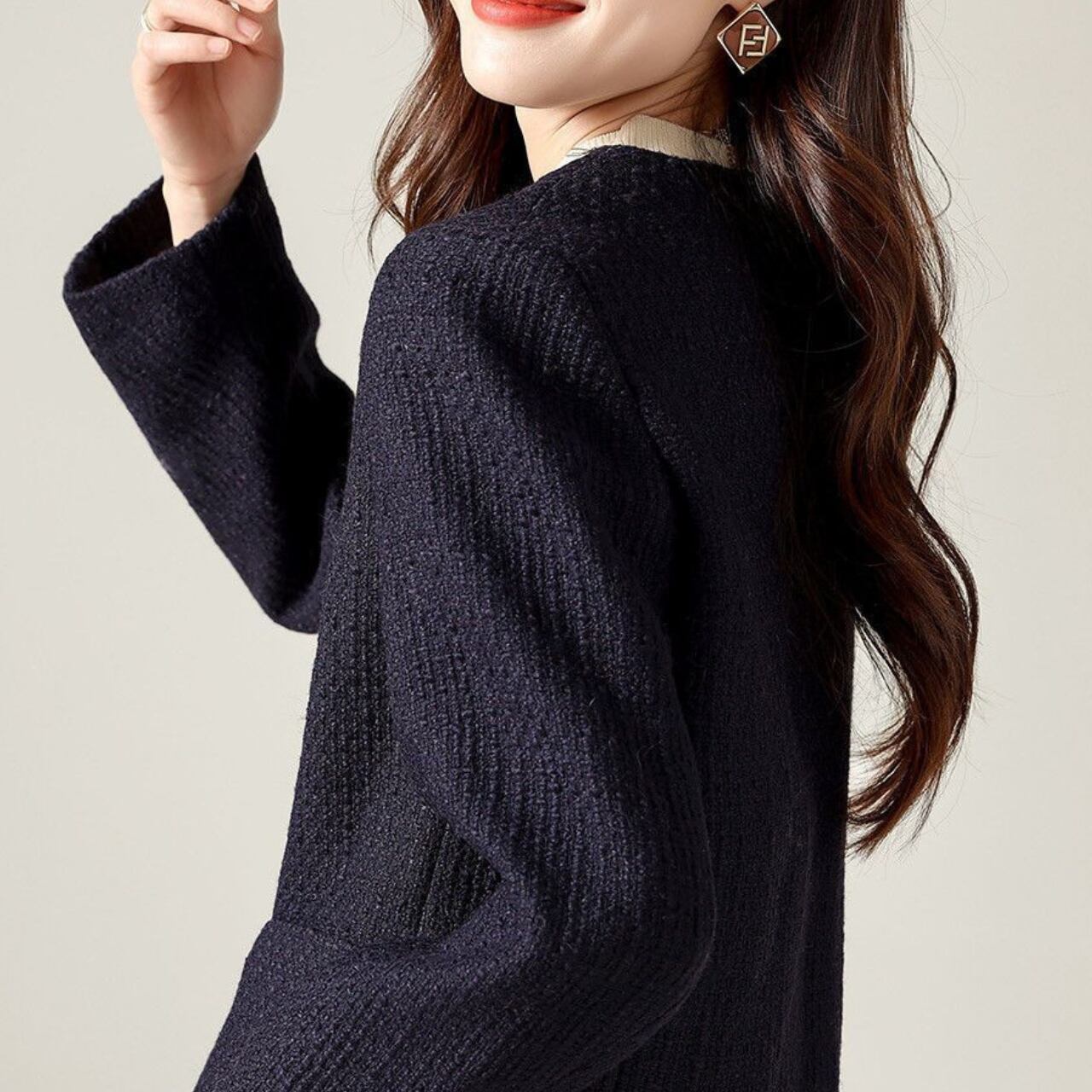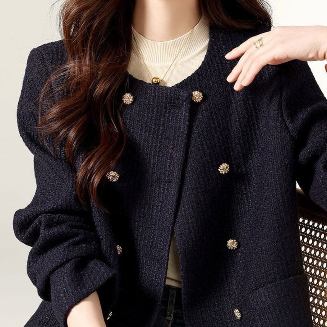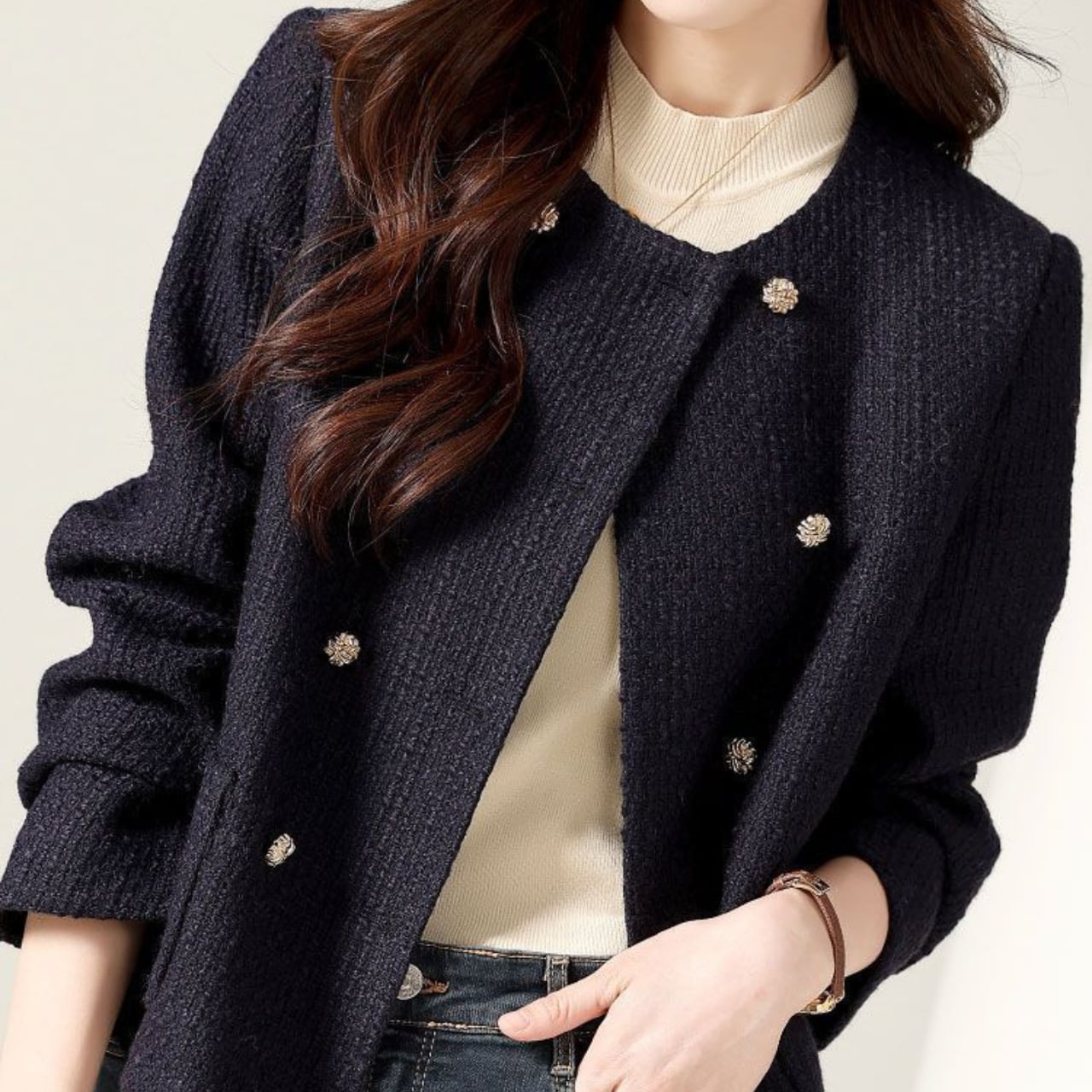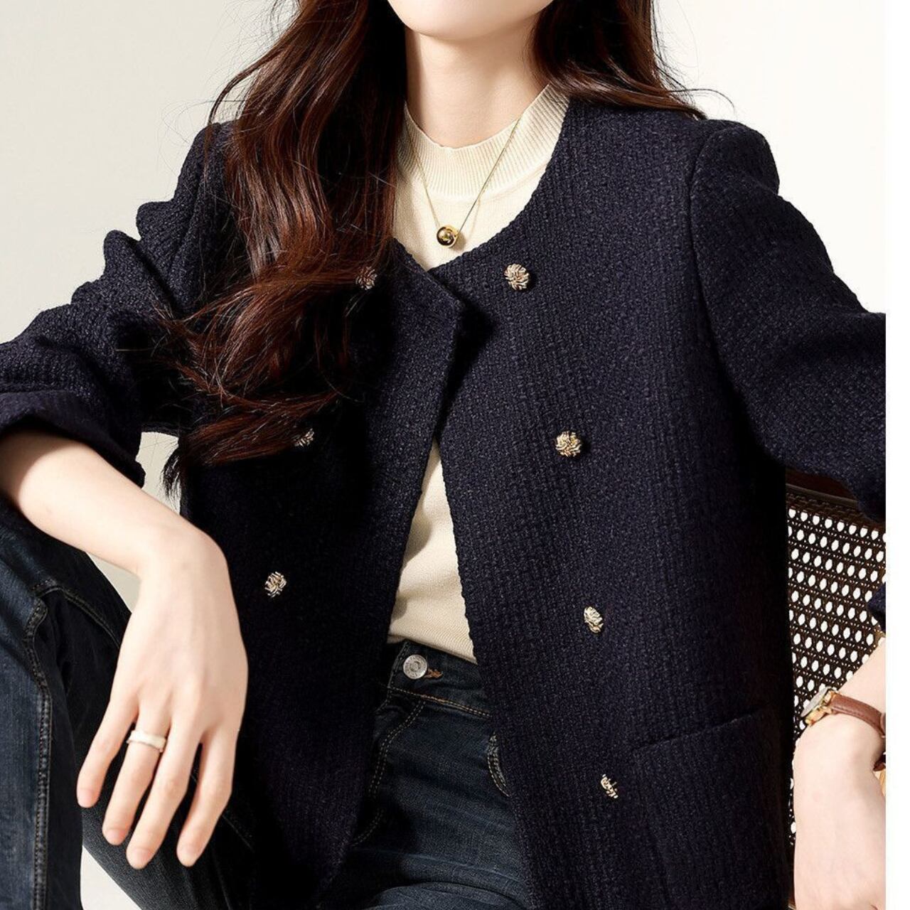 ノーカラーのデザインが、インナーを選ばず様々なスタイリングにマッチします。