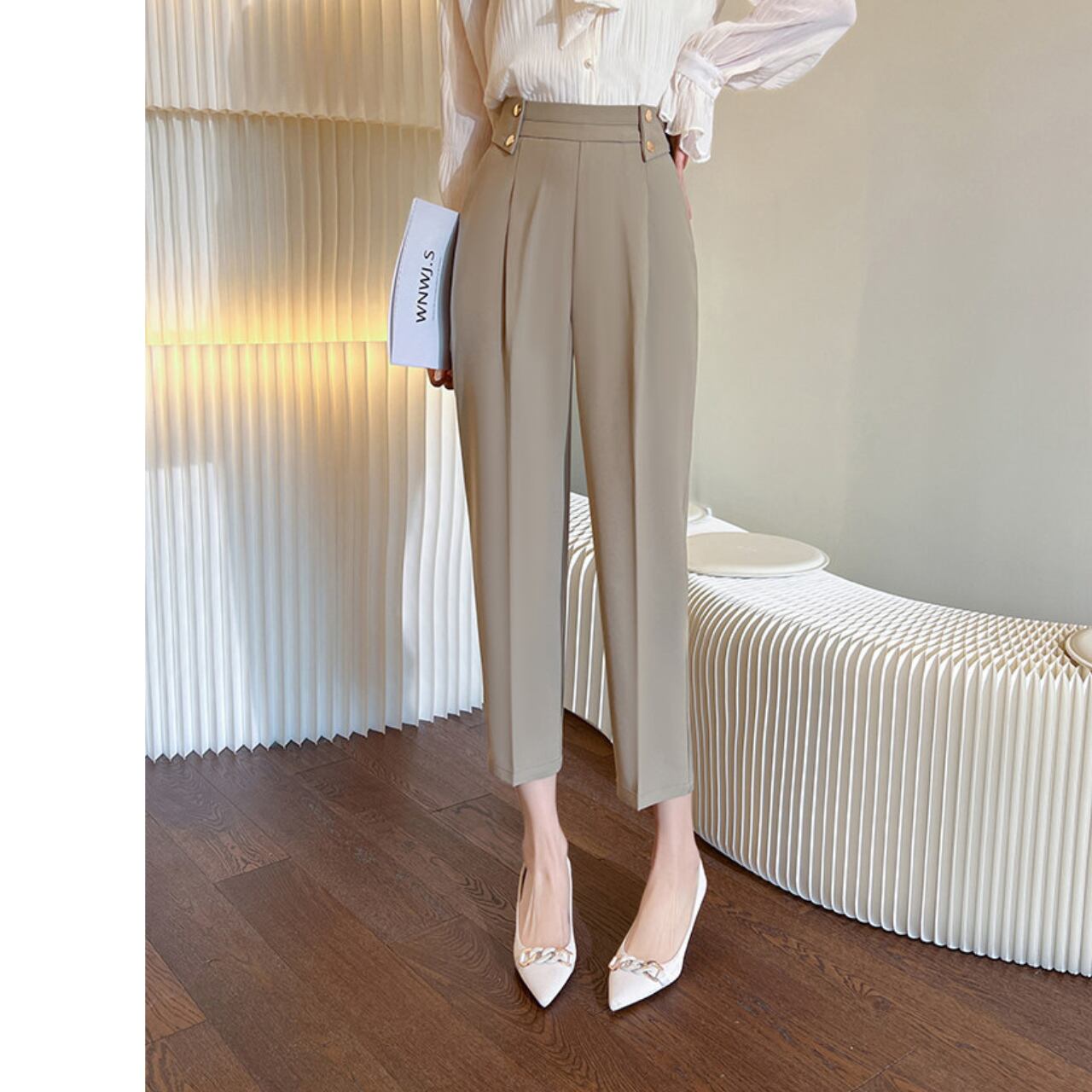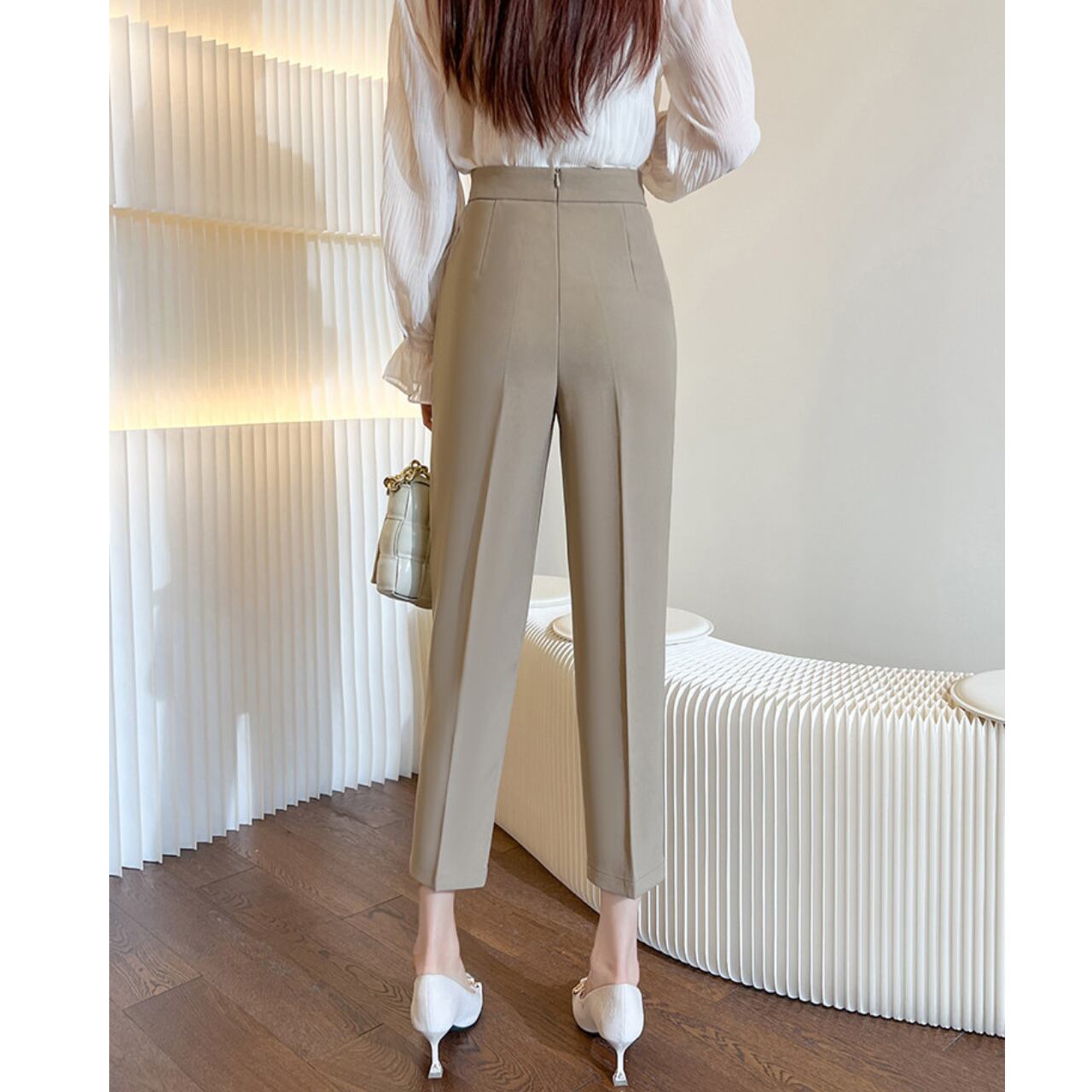 オフィスにもデイリーにも活躍する、上品な印象のクロップド丈パンツ。