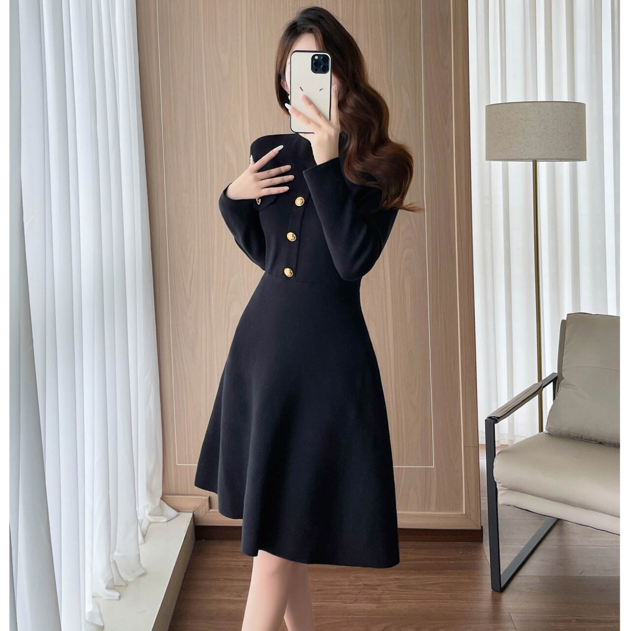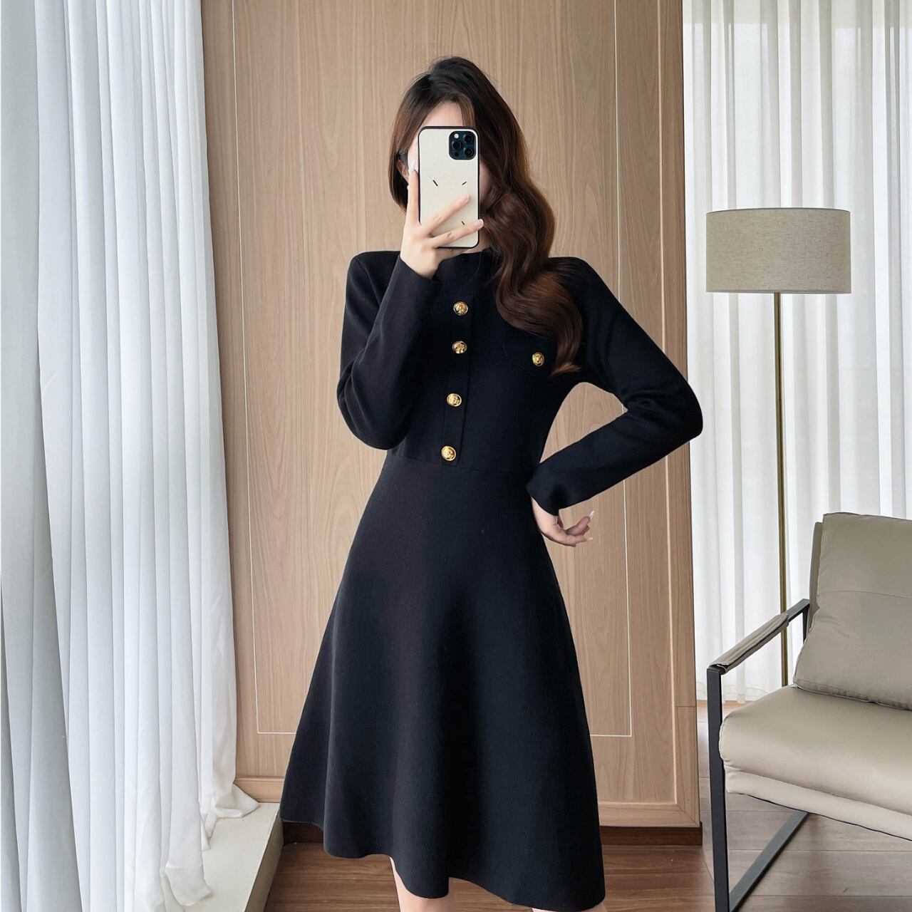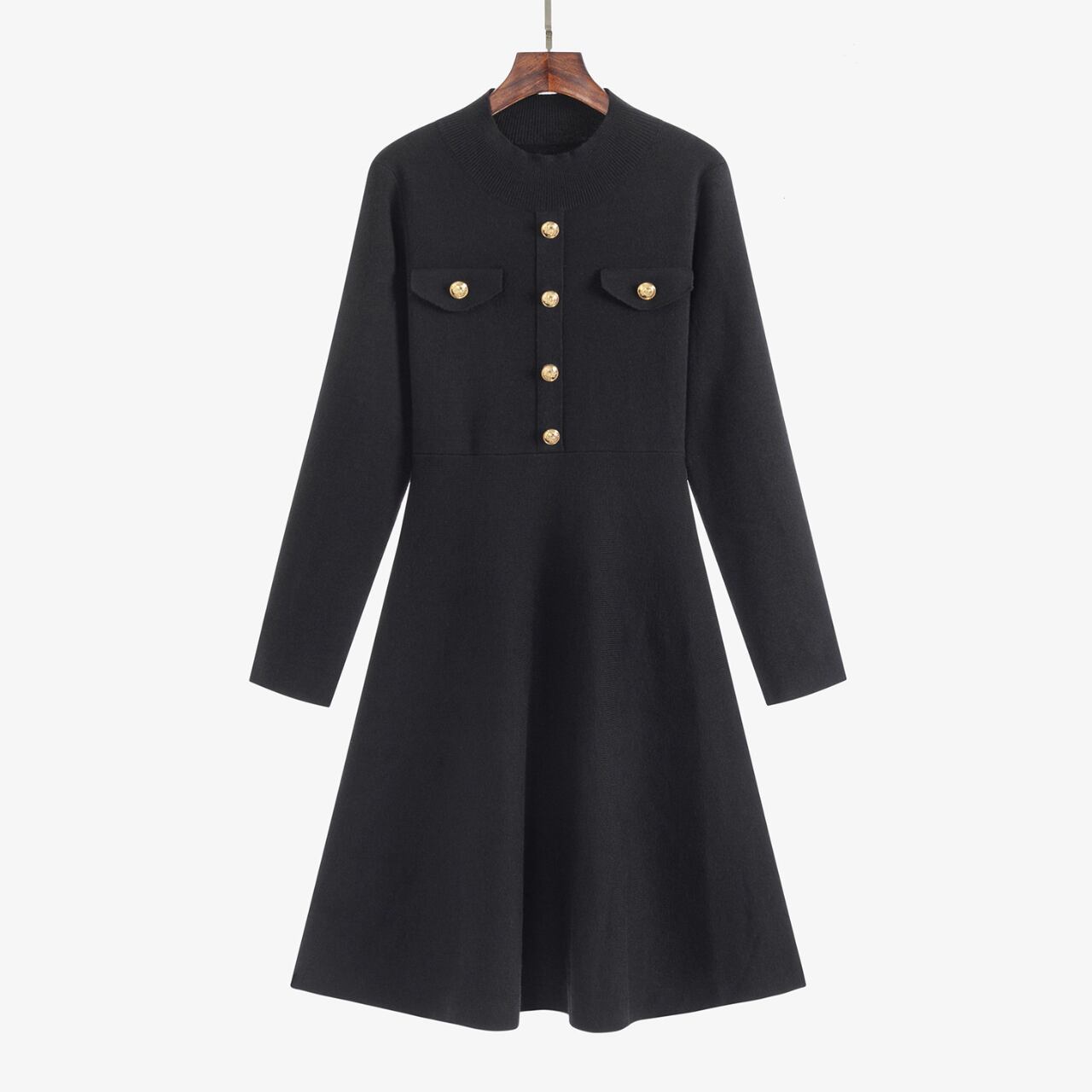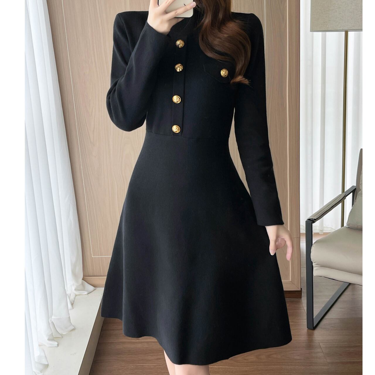 ボタンフロント ミモレ丈 長袖 Aラインワンピース 1col 00027