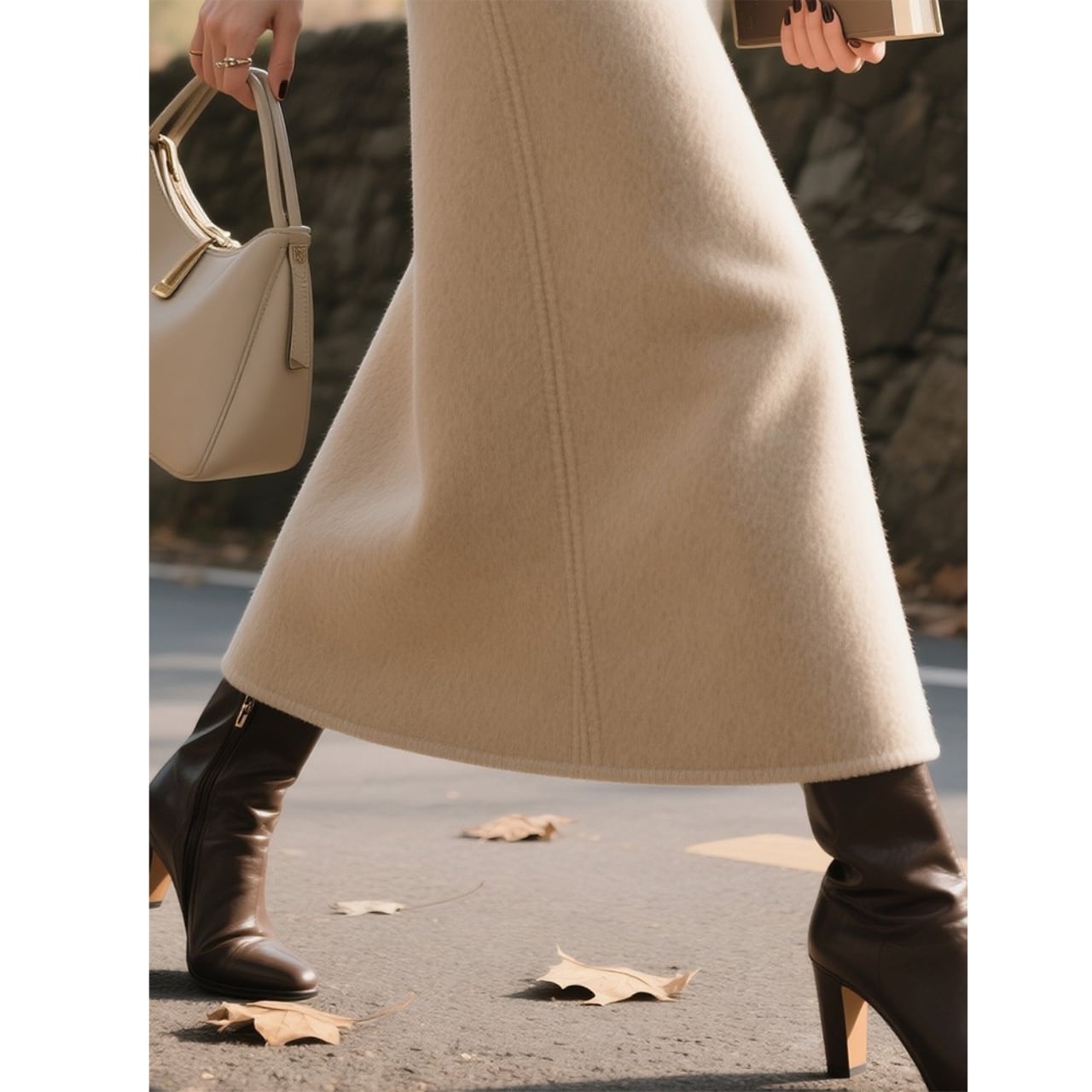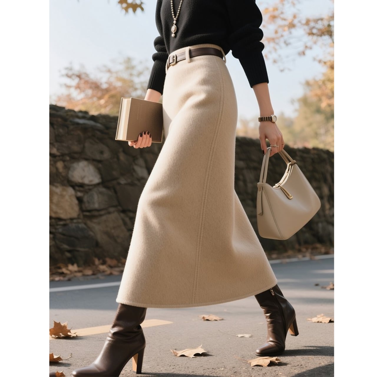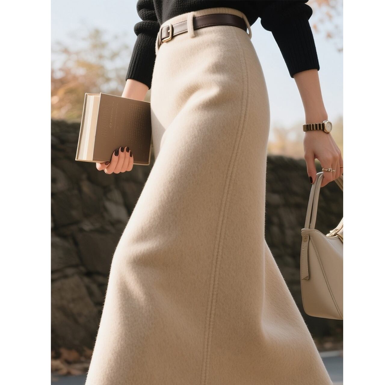 ウエストマークでスタイルアップを叶える、ベルト付きミモレ丈スカート。