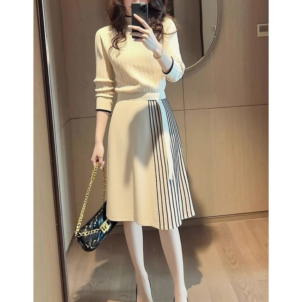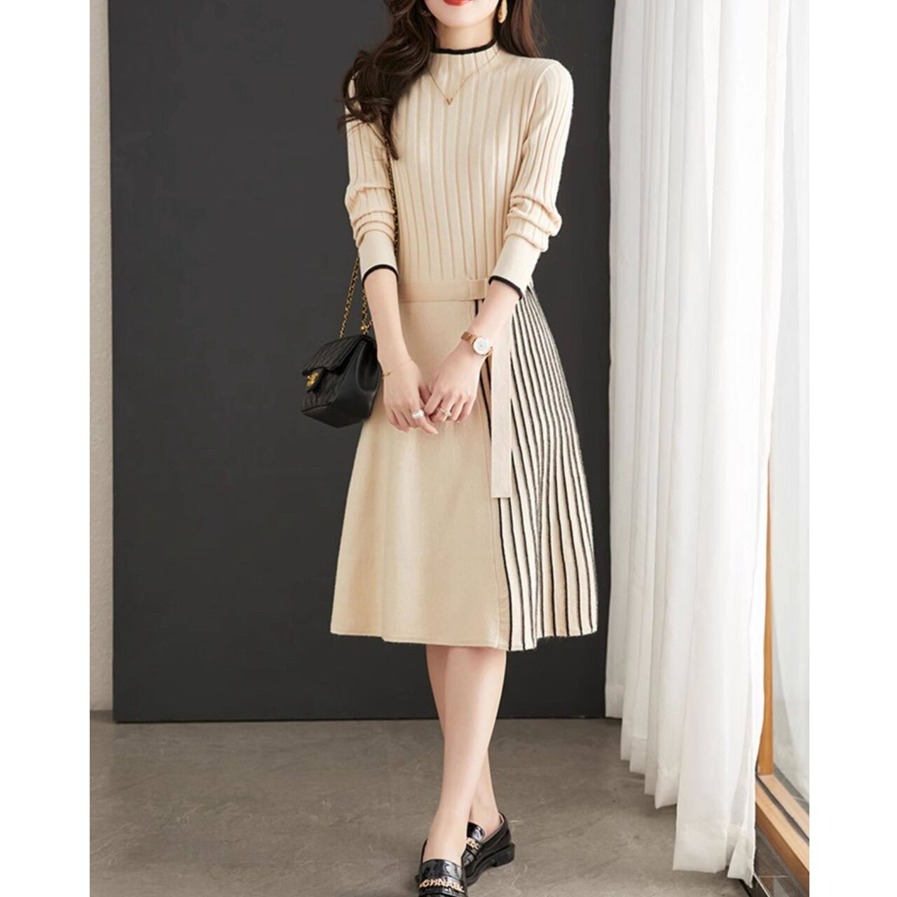 長袖 ウエストマーク Aライン ワンピース 1col 00036