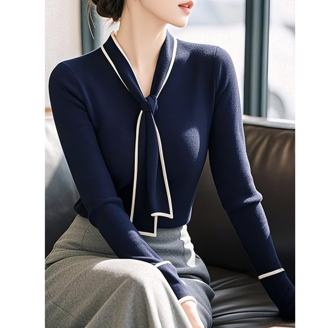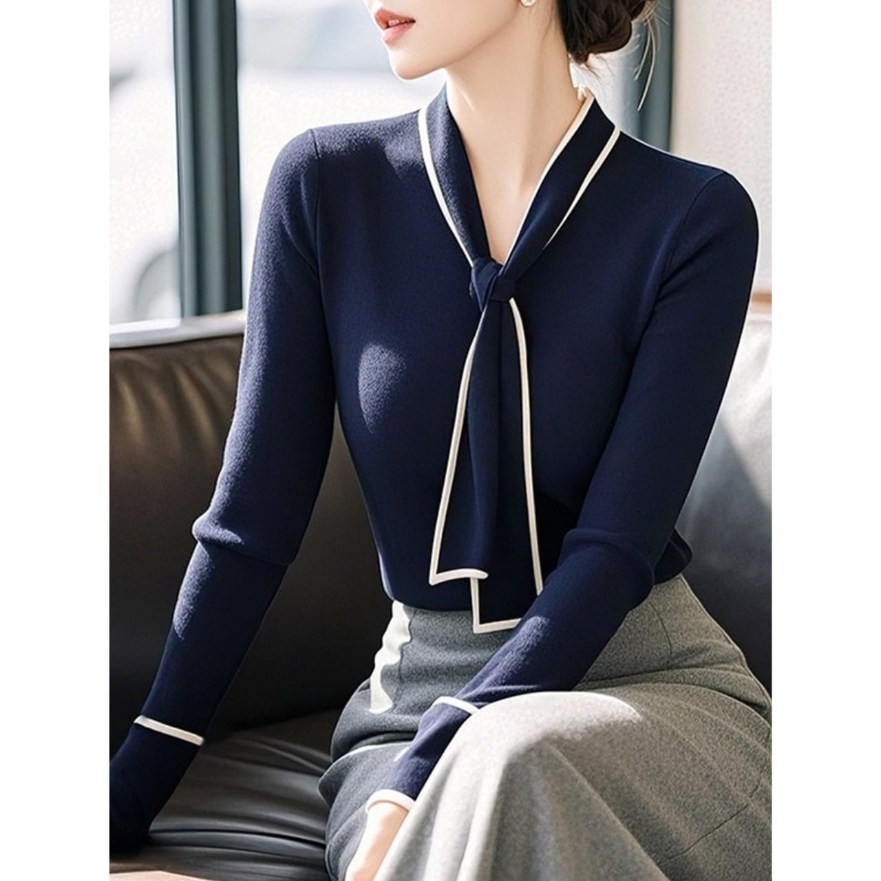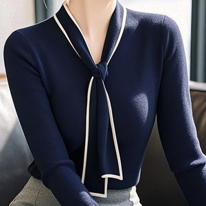 シンプルなデザインの中に、タイが映える長袖ニットトップス。