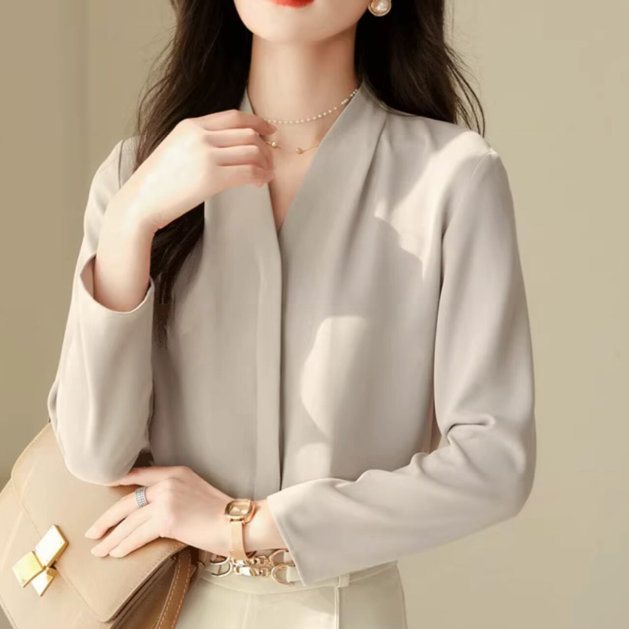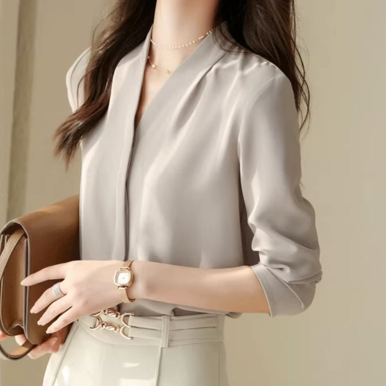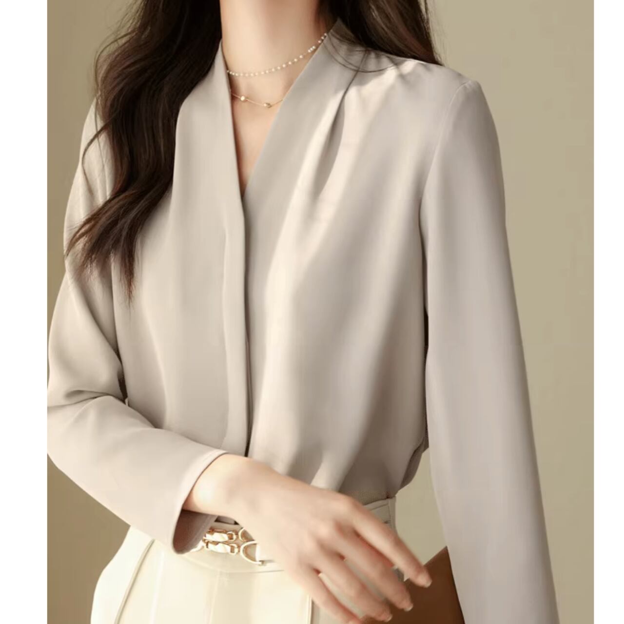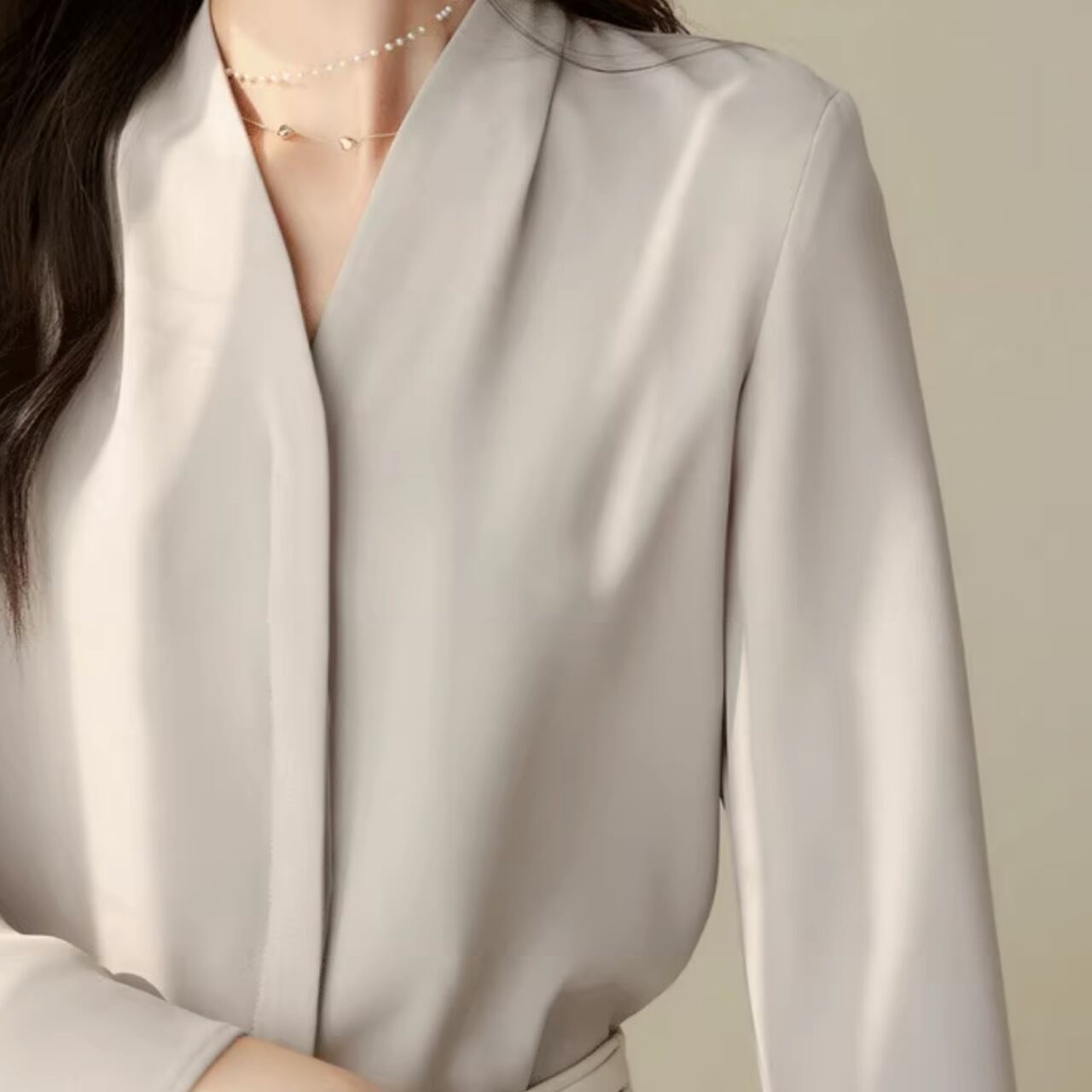 すっきりとしたVネックと、自然なドレープが上品な印象を与える長袖ブラウス。