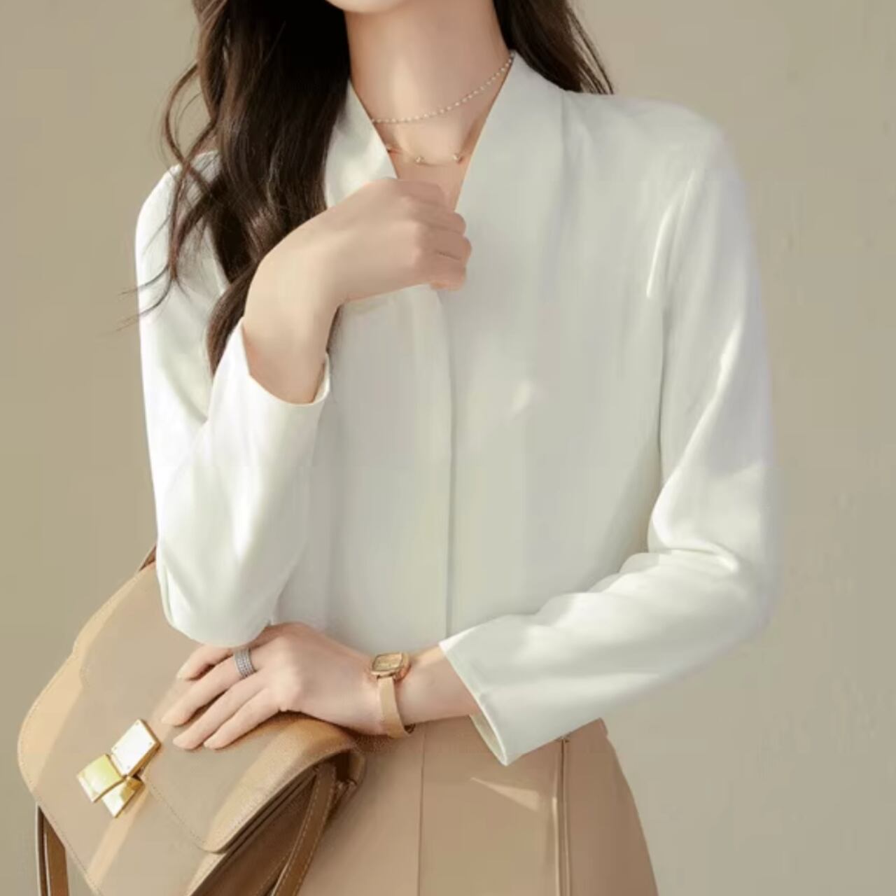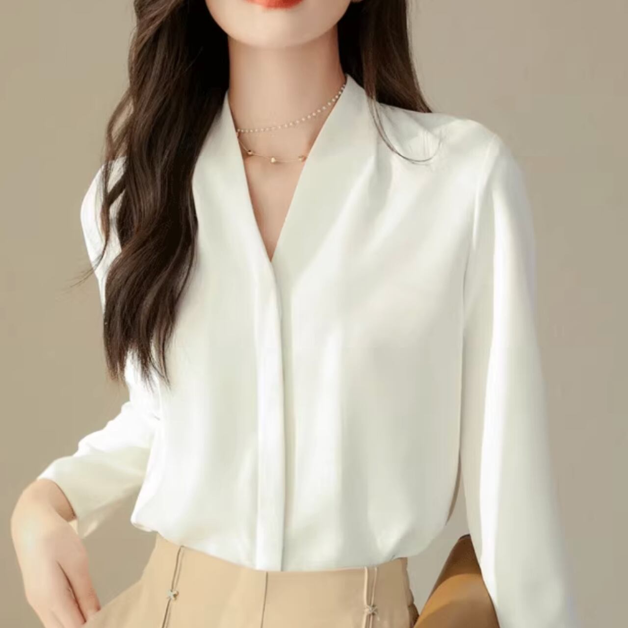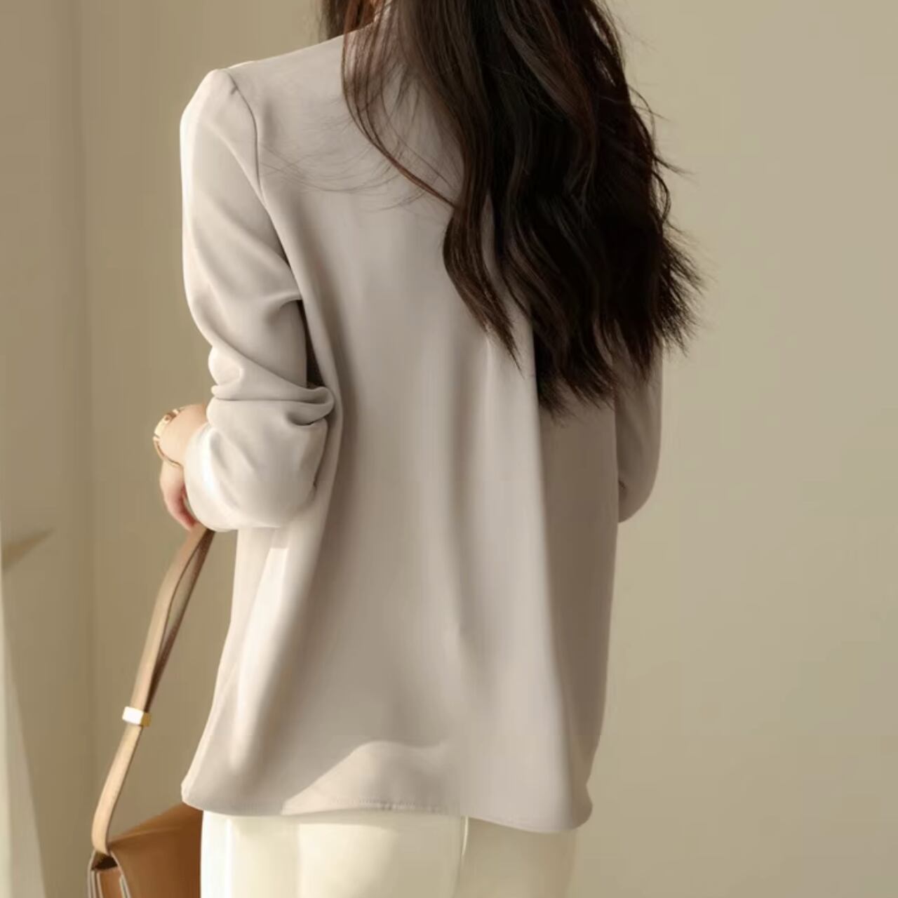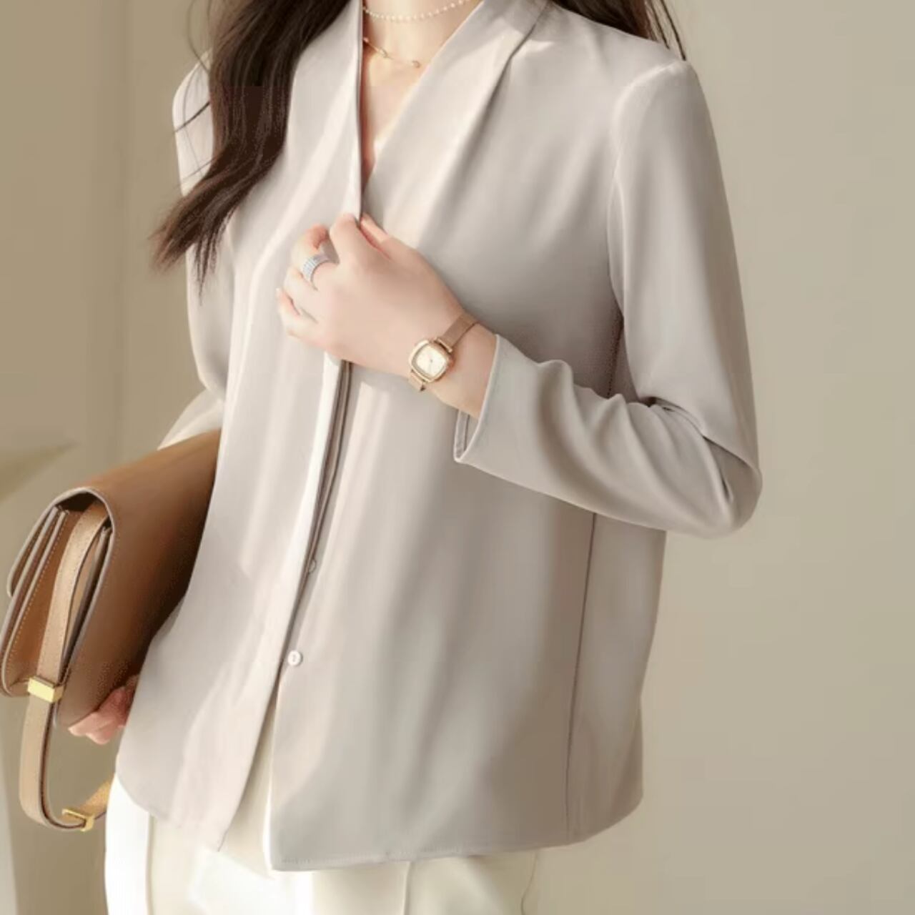 すっきりとしたVネックと、自然なドレープが上品な印象を与える長袖ブラウス。