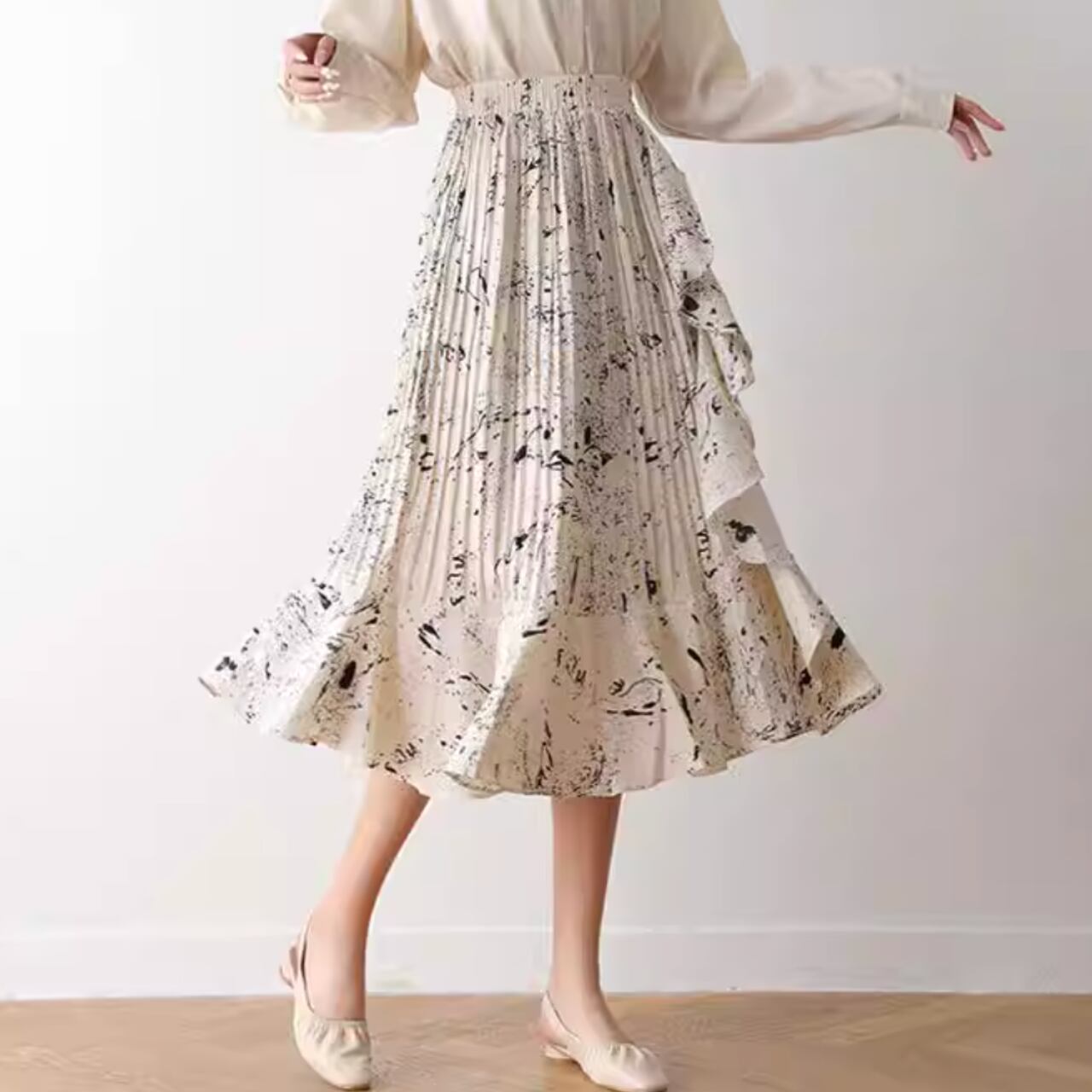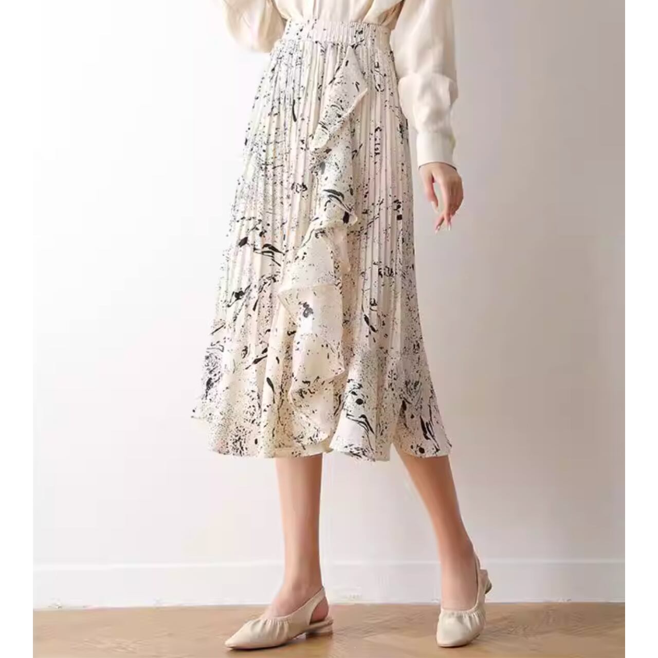 フリル付き ミモレ丈 プリーツスカート 00059