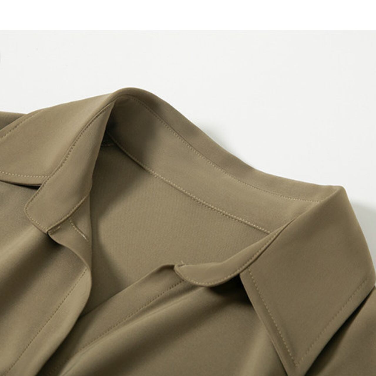 すっきりとしたオープンカラーが、デコルテラインを美しく演出。