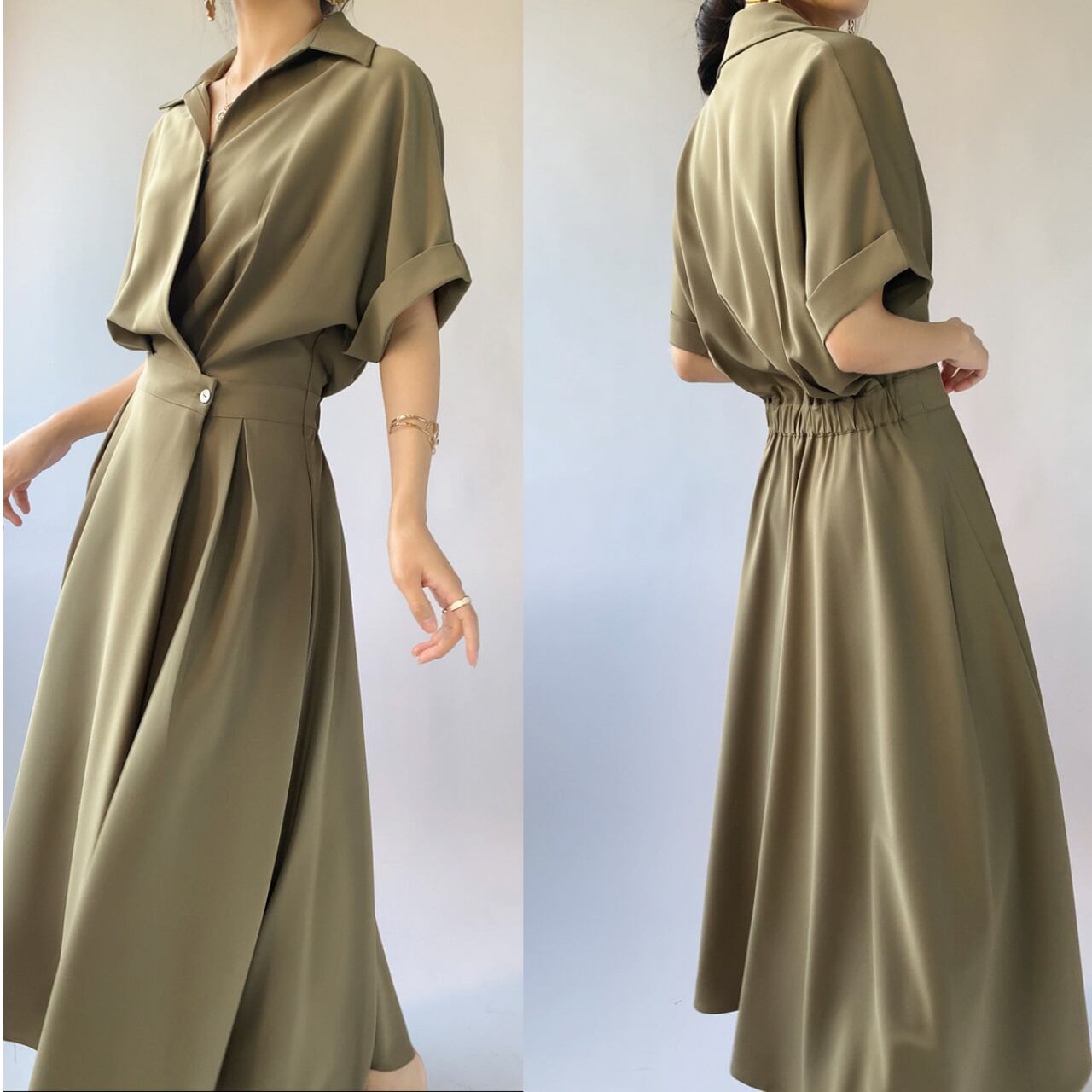 ウエストの切り替えとミモレ丈のフレアシルエットが、上品で女性らしい印象を与えます。