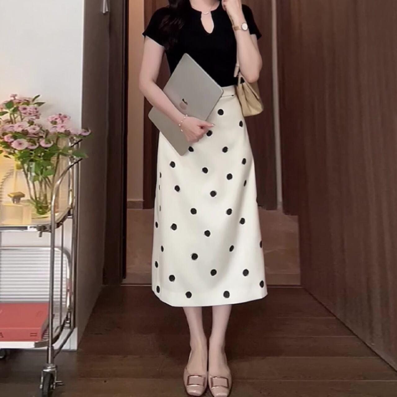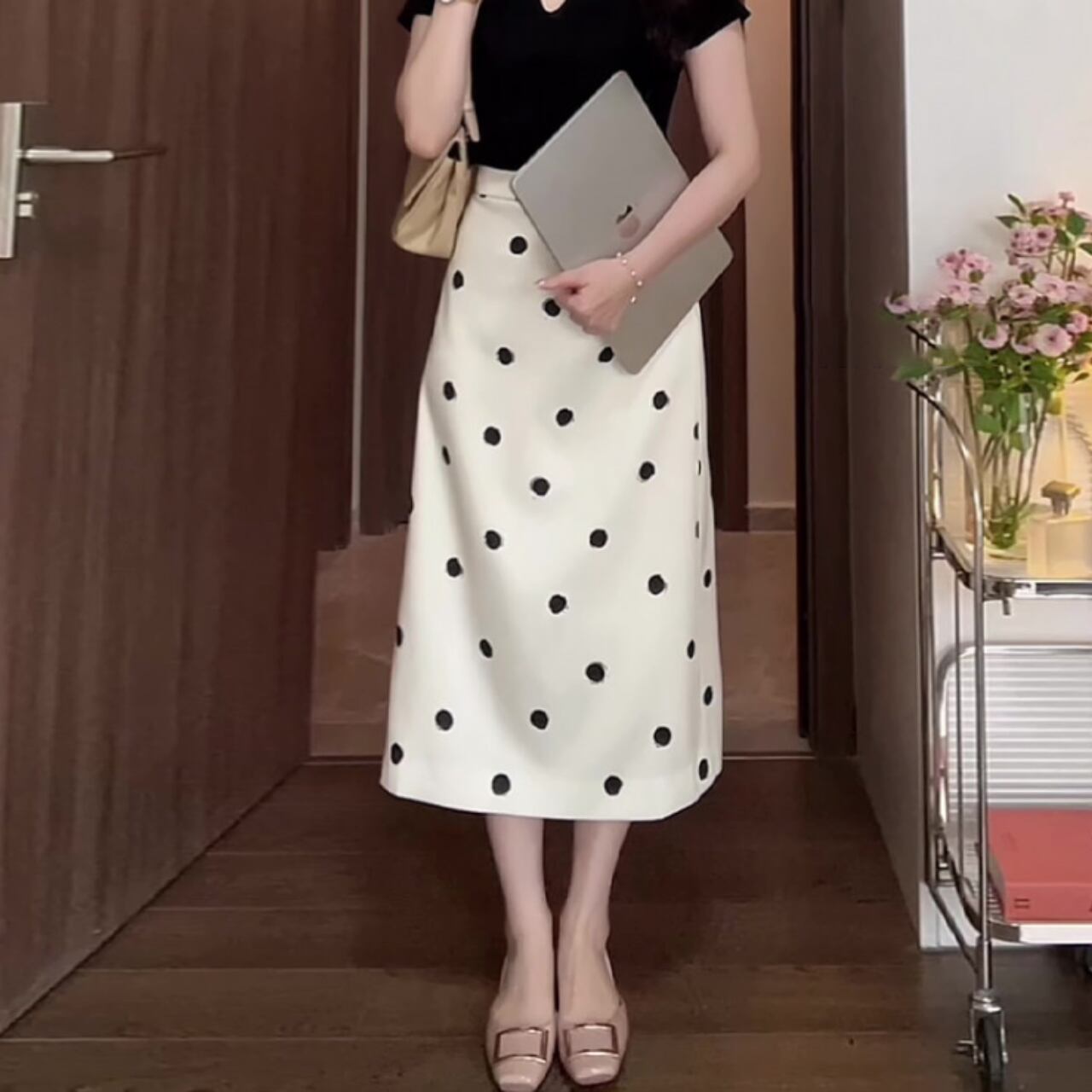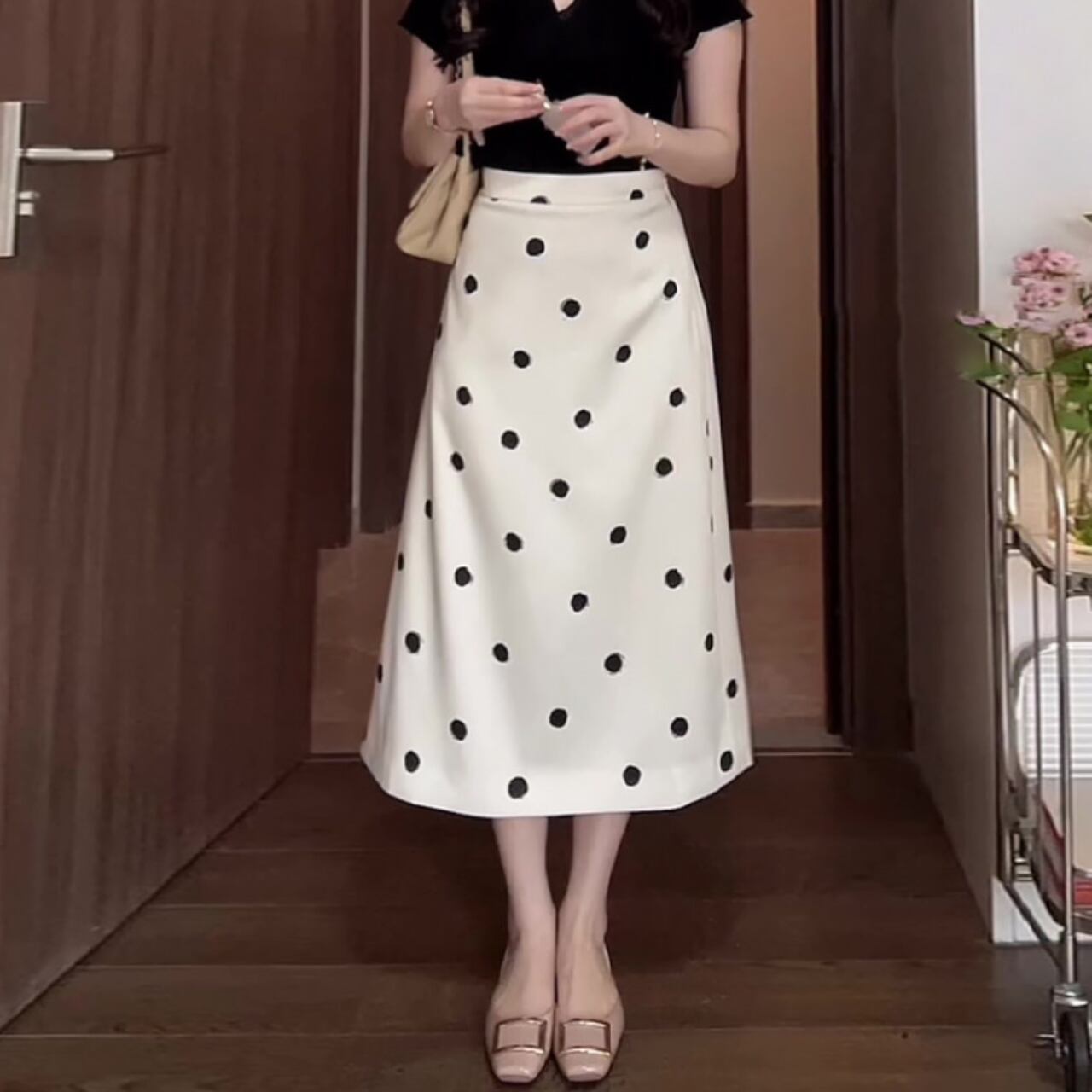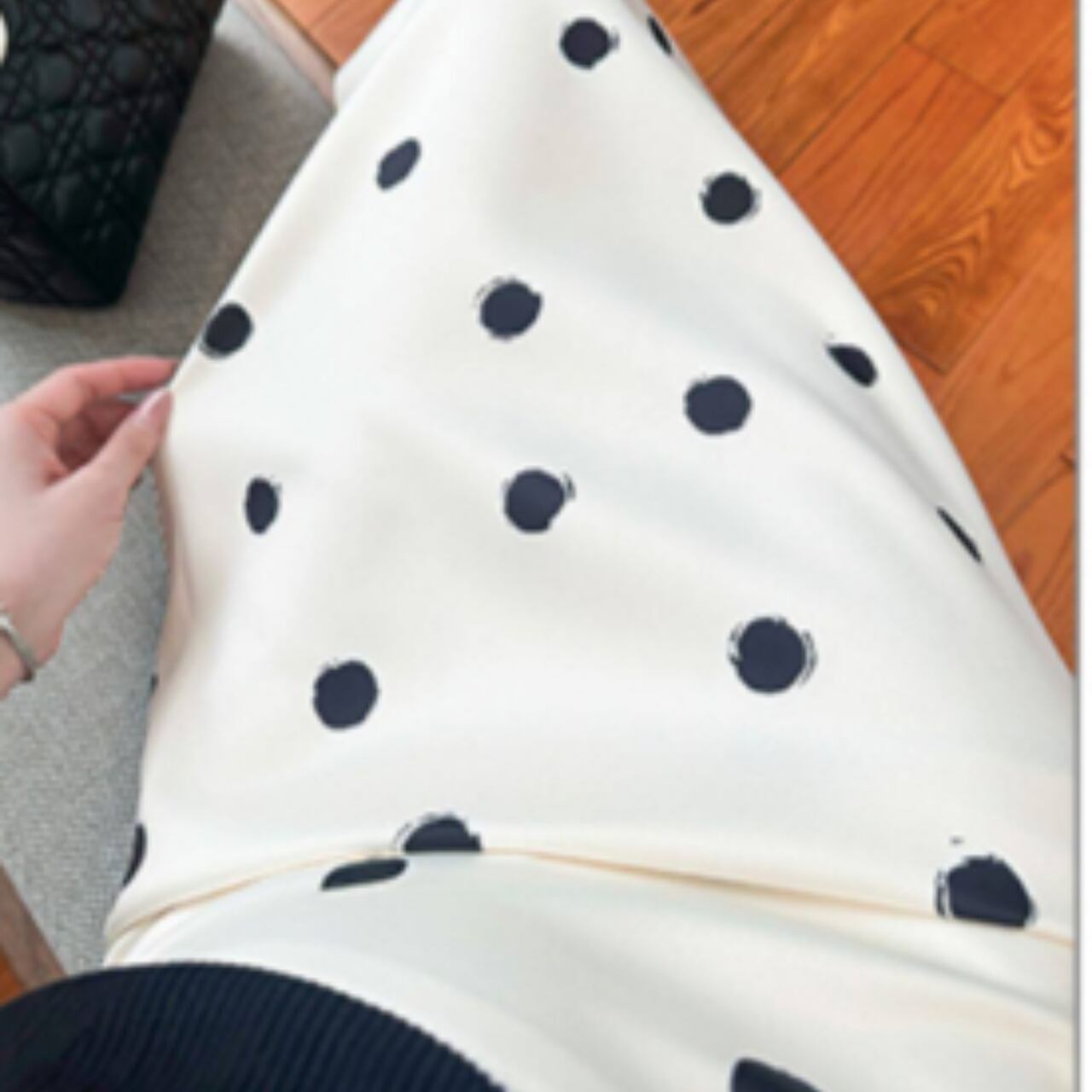 クラシカルな雰囲気漂う、ドット柄のミモレ丈Aラインスカート。