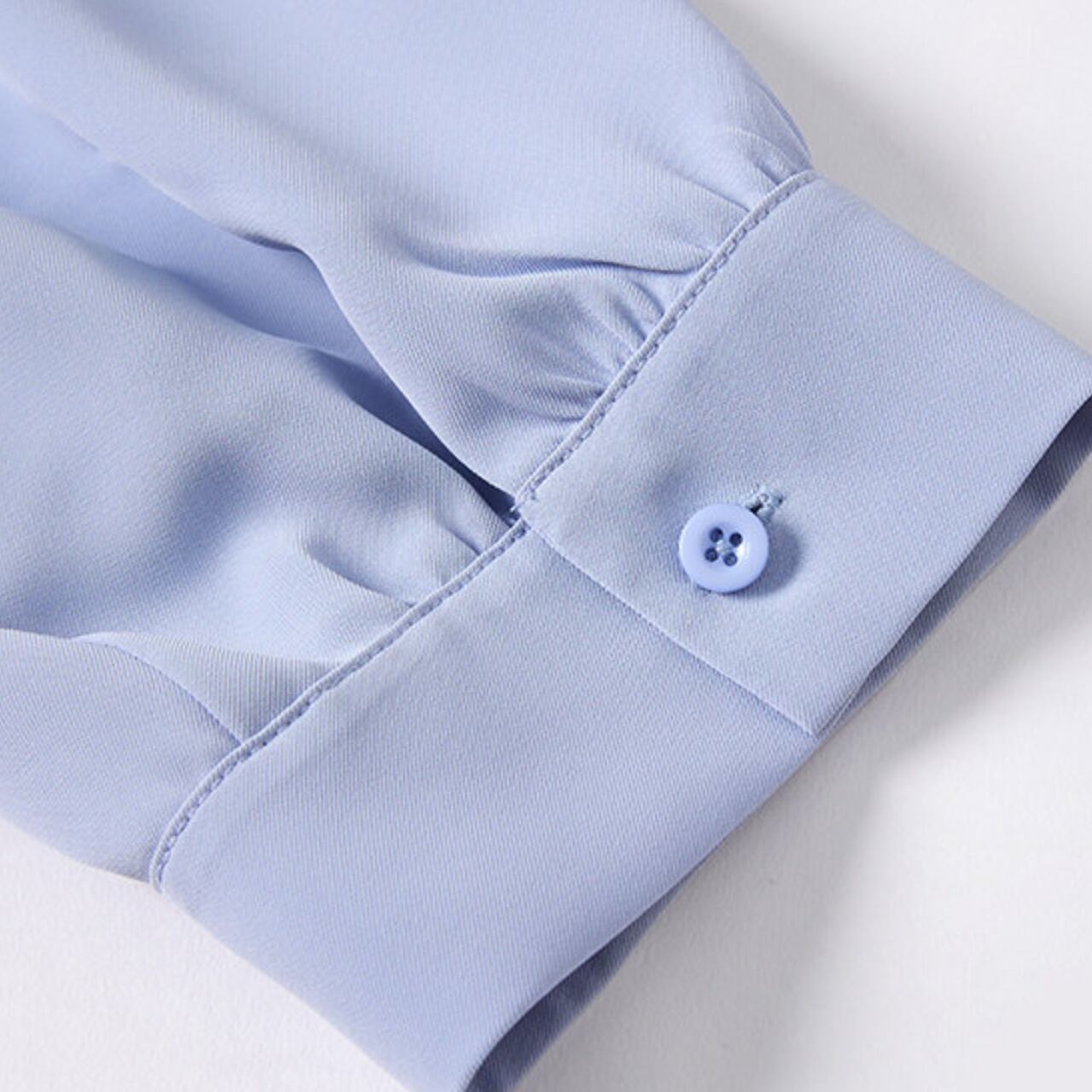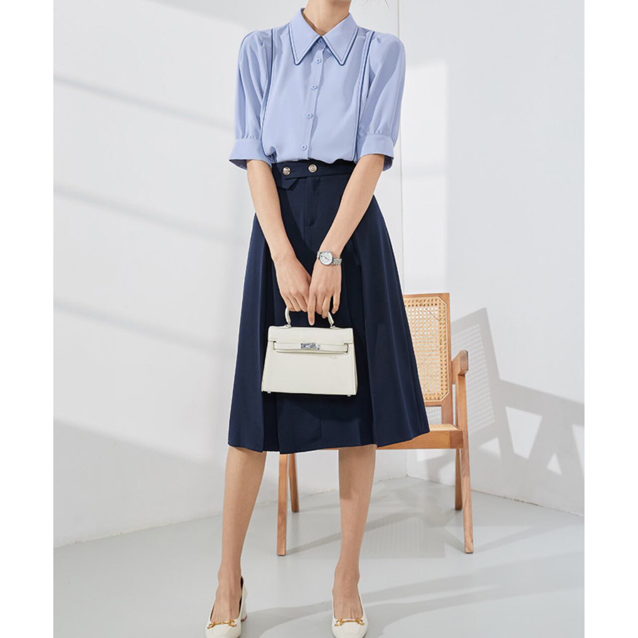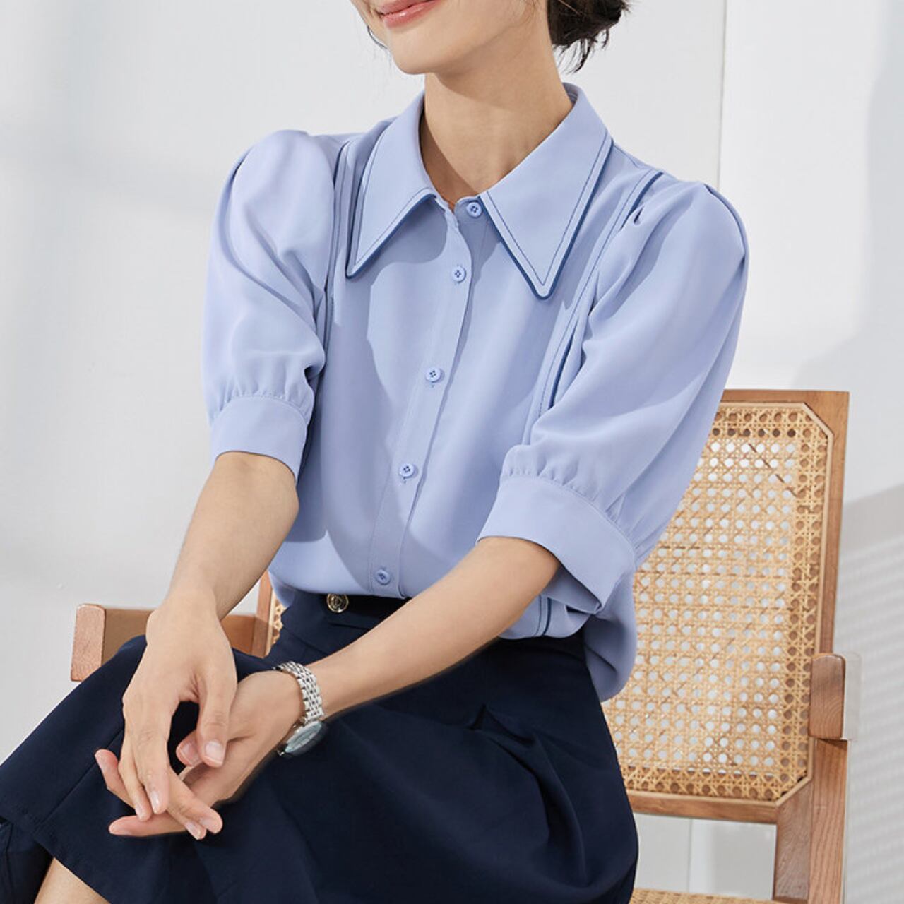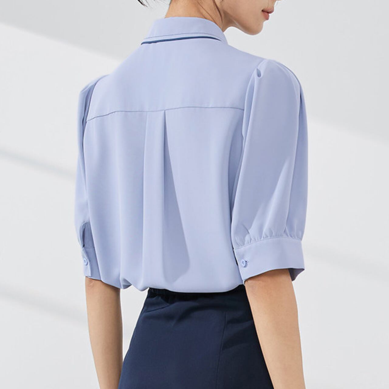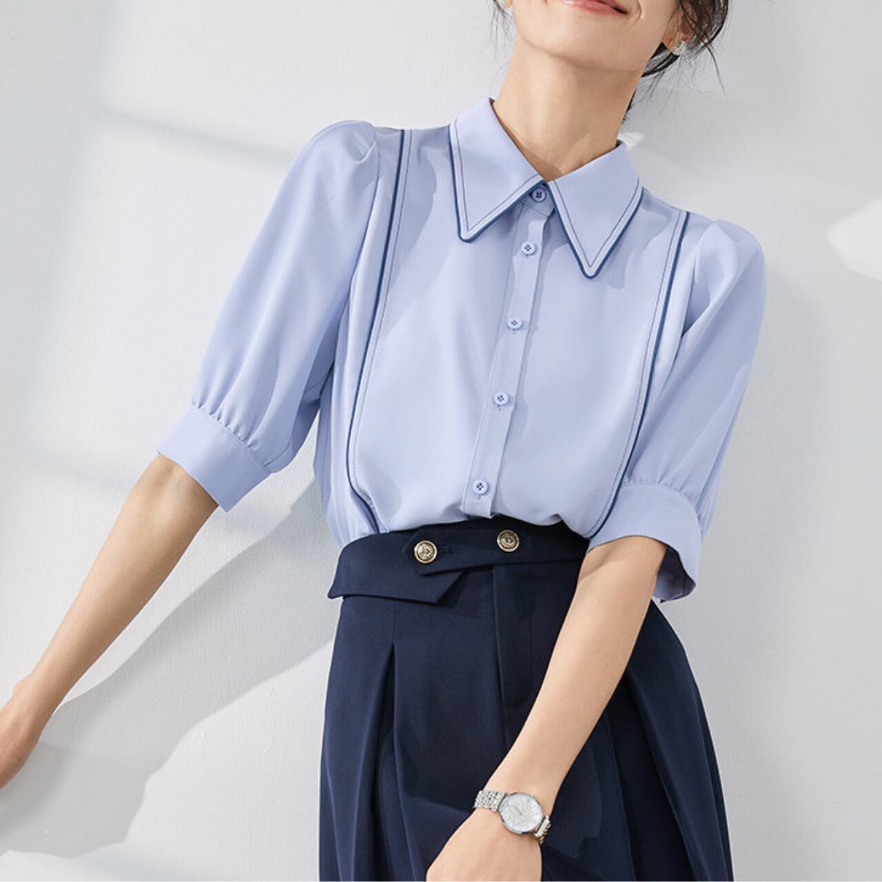きちんと感と女性らしさを両立する半袖シャツブラウス。