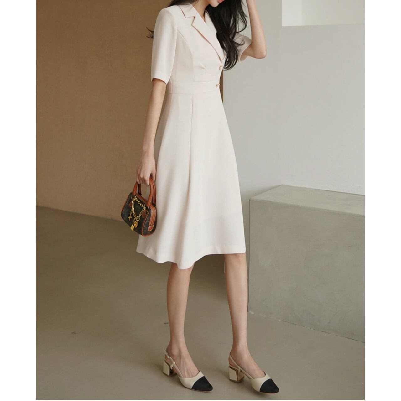 ダブルブレストとノッチドラペルが上品な印象を与え、ミモレ丈のフレアスカートが優雅さを演出。
